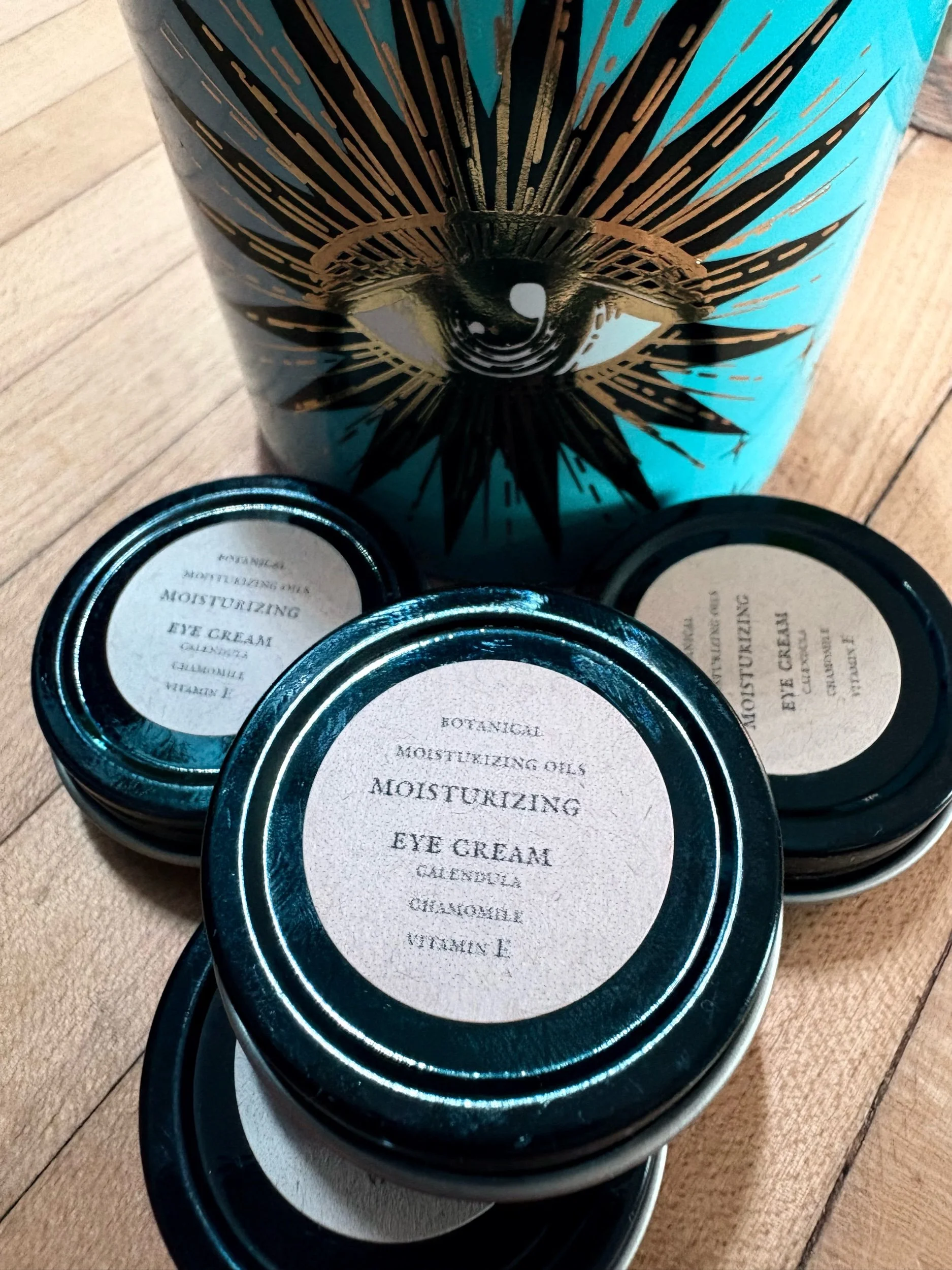 A blend of Moisturizing butters and oils infused with Calendula , Chamomile and Vitamin E. This is gentle and nourishing to the eye area with the added healing benefits of Calendula and vitamin E as well as the calming properties of Chamomile.